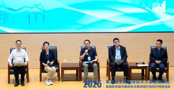 圆桌讨论环节,西安外国语大学高级翻译学院副院长曹达钦、华云鹏、北京第二外国语学院高级翻译学院副院长姜钰、广东外语外贸大学高级翻译学院副院长王巍巍、开云体育人工智能翻译实验室主任朱华围绕人工智能技术与翻译行业融合创新、复合型翻译人才培养、翻译从业者技术素养提升等议题进行了探讨交流。