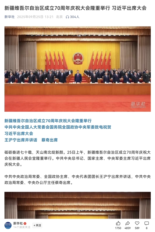 新疆维吾尔自治区成立70周年庆祝大会隆重举行中共中央全国人大常委会国务院全国政协中央军委致电祝贺习近平出席大会王沪宁出席并讲话 蔡奇出席