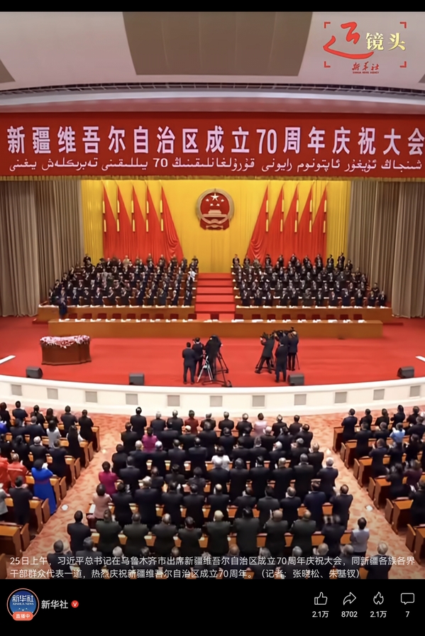 砥砺奋进七十载,天山南北绽新颜。25日上午,新疆维吾尔自治区成立70周年庆祝大会在新疆人民会堂隆重举行。中共中央总书记、国家主席、中央军委主席习近平出席庆祝大会。