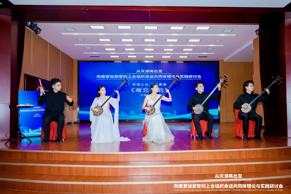 与会嘉宾一同观看“津彩上合 共绘新卷——上合组织命运共同体研究中心成果回顾”视频短片,透过镜头感受天津这座城市在服务国家外交大局中的担当与作为。天津音乐学院青年三弦演奏家高艺真副教授和她的学生们带来三弦重奏《难忘津韵》,精湛的技艺和深刻的艺术感染力收获现场热烈掌声