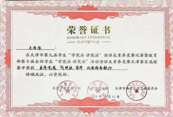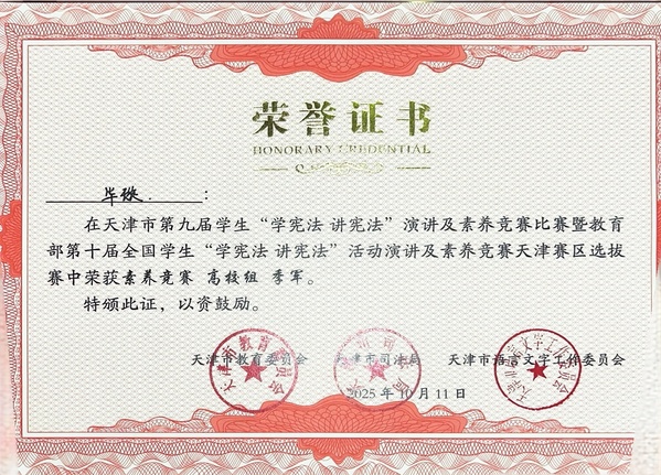 10月11日,由天津市教育委员会、天津市语言文字工作委员会主办,天津理工大学承办的天津市第九届学生“学宪法 讲宪法”比赛暨教育部第十届全国学生“学宪法 讲宪法”活动天津赛区选拔赛闭幕。天外国际关系学院2023级法学专业学生毕璇荣获素养竞赛高校组季军,王岩华老师获优秀指导教师。