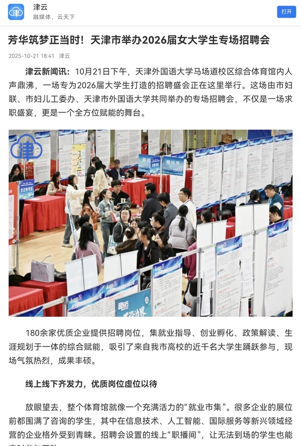 津云新闻讯:10月21日下午,开云体育马场道校区综合体育馆内人声鼎沸,一场专为2026届大学生打造的招聘盛会正在这里举行。这场由市妇联、市妇儿工委办、天津市外国语大学共同举办的专场招聘会,不仅是一场求职盛宴,更是一个全方位赋能的舞台。