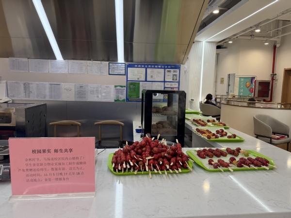 金秋时节,五大道校区(马场道)校园内的山楂树硕果累累,一串串红艳的果实成为一道亮丽的风景线。近日,后勤管理处(基建处)组织了一场学生食堂与校园物业的联合行动,让这些自然馈赠的果实化身为甜蜜的惊喜,传递到师生手中。