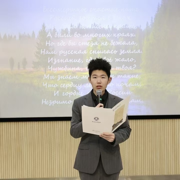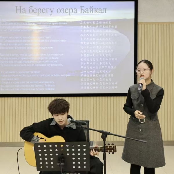 天外学子带来精彩纷呈的文艺节目。蒋逸潇、恩珠分别朗诵了中俄经典诗歌《祖国》《噢,我的母亲,俄罗斯,罗斯……》付家齐以二胡独奏串烧《莫斯科郊外的晚上》《赛马》,赢得阵阵掌声刘锦添、于怡然合作的吉他弹唱《贝加尔湖畔》将现场气氛推向高潮,展现了中俄文化交融的独特魅力。