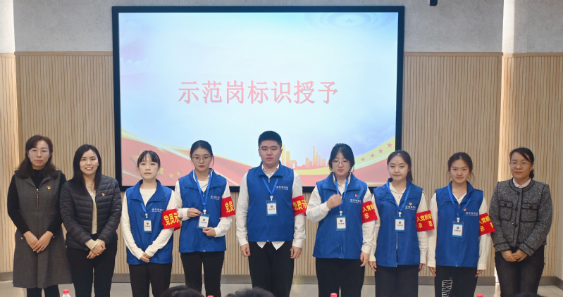 仪式设置特色标识授予环节,校团委副书记刘萍及学院副院长朱丽彬、骆元媛为示范岗成员颁发工作服、工作证及袖标等“责任信物”,激励其践行服务承诺、落实岗位职责。