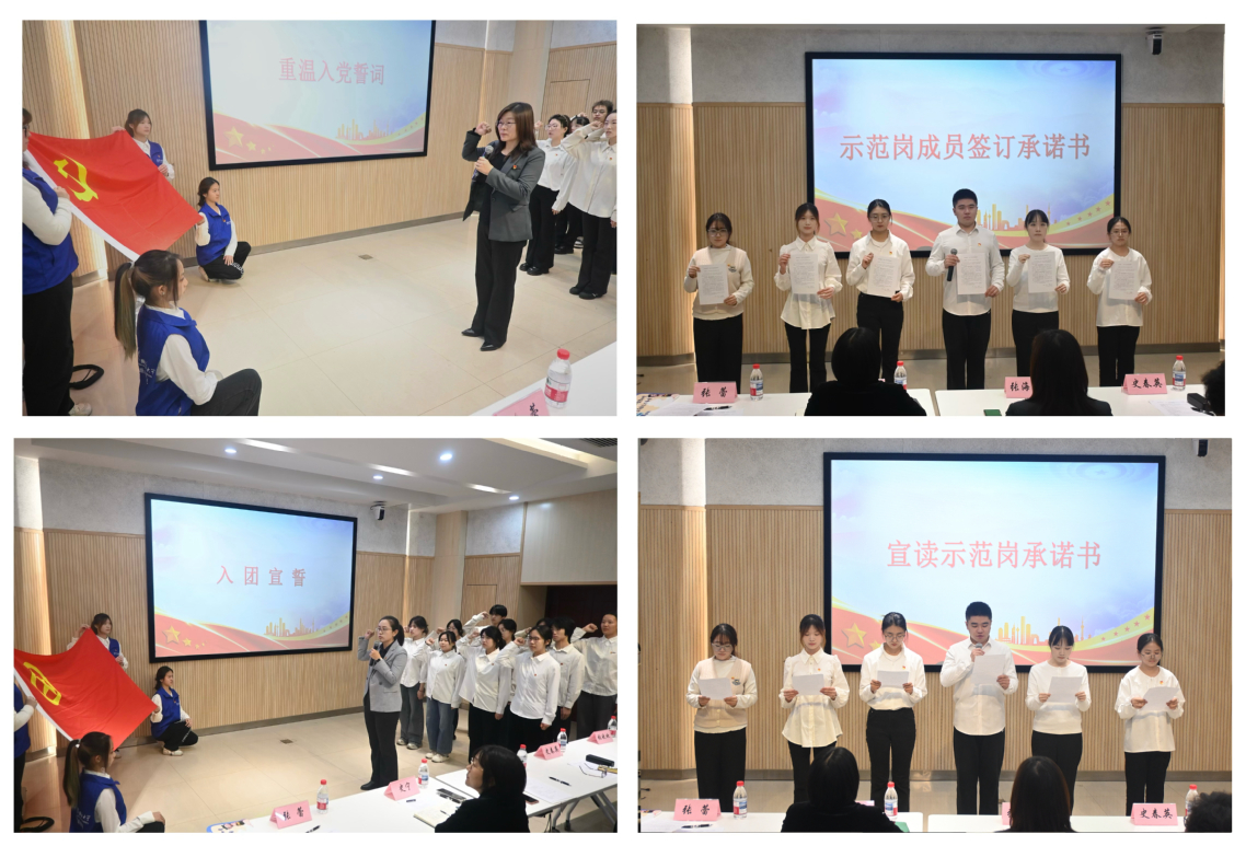 “我志愿加入中国共产党……”在学院党总支书记张海梅的领誓下,全体党员重温入党誓词,铮铮誓言既是理想信念的锤炼,更是服务同学的庄严承诺。随后,学院团委书记苏瑾带领新入团同学宣誓,党建引领团建的实践使红色基因代代相传,为示范岗注入青春动能。示范岗成员现场签订《承诺书》,党员代表郑奕珂带领宣读其核心内容,“亮身份、作表率、优服务”的誓言传递出坚定服务信念。