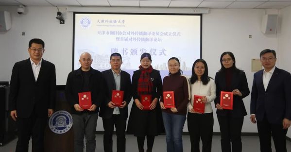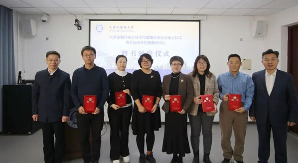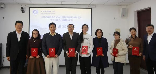 在聘书颁发仪式环节,与会领导为天津市翻译协会对外传播翻译委员会负责人及委员代表颁发聘书。汪淳波任委员会主任,周薇、王庆勇、武玉莲、于杰、姚委委、陈勇、杨珍珍、徐伟任副主任委员。