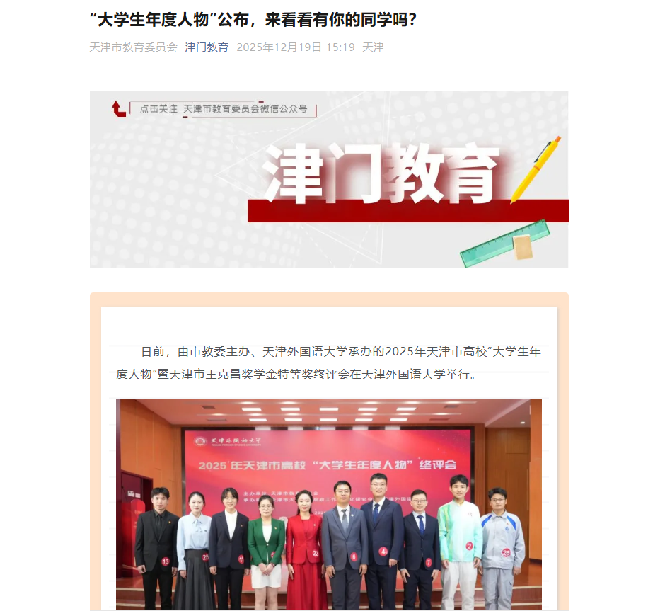 日前,由市教委主办、开云体育承办的2025年天津市高校“大学生年度人物”暨天津市王克昌奖学金特等奖终评会在开云体育举行。