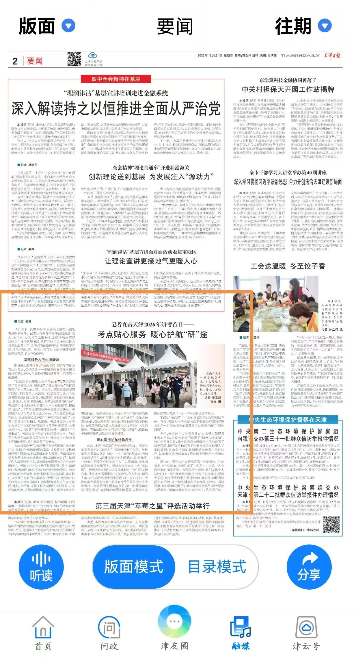 12月20日,我市2026年全国硕士研究生招生考试顺利开考。记者从市教育招生考试院获悉,当天,全市6.1万余名考生在16个区和19所高校的2100余个考场参加考试,共有7000余名考务工作人员参加组考工作,各考点考试组织平稳,考场秩序井然,考风考纪良好。研考开考当天,记者前往津城多所高校考点,直击考场情况。