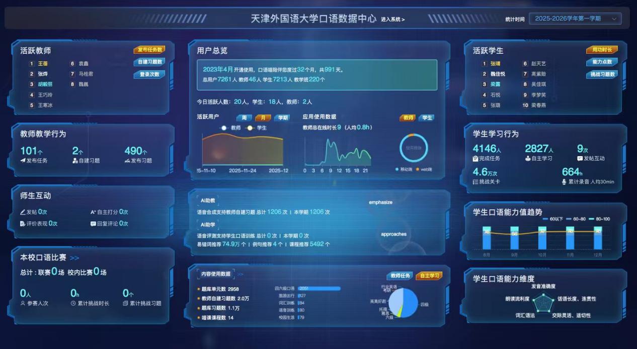 口语训练与测验研究平台,辅助教师进行高效、个性化的口语教学管理与数据分析,为学生提供多领域实战训练与即时智能评测反馈,有效激发学习动力,突破传统口语课堂的局限。