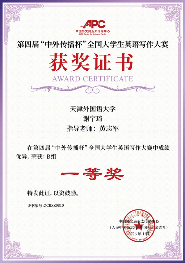 近日,第四届“中外传播杯”全国大学生英语写作大赛获奖名单正式揭晓,天外学子凭借扎实的语言功底与精湛的写作能力脱颖而出,在全国1700余所院校、6万余名参赛者的激烈角逐中斩获累累硕果,共有21人获一等奖、38人获二等奖、63人获三等奖、112人获优秀奖,获奖人数达234人,充分彰显了学校外语教学的扎实成效与人才培养的显著优势。