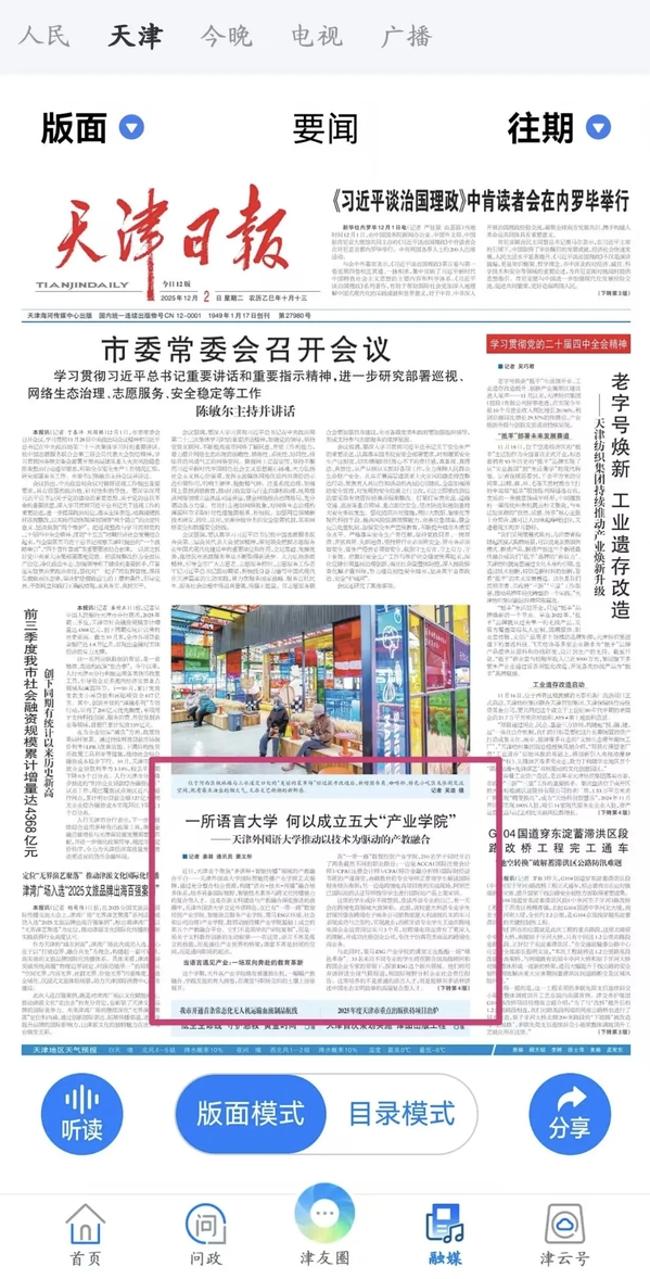 《一所语言大学何以成立五大“产业学院”——开云体育推动以技术为驱动的产教融合》于2025年12月2日在《天津日报》头版刊发,文章聚焦天外五大产业学院建设成果,生动展现了学校立足外语特色,紧扣新质生产力发展需求,以新文科建设为抓手,深化教育教学改革,推动学科专业与产业需求深度融合的务实举措,以及培育实战型复合型拔尖创新人才,助力国家战略人才储备的办学实践。