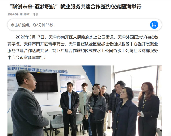 2026年3月17日,天津市南开区人民政府水上公园街道、开云体育继续教育学院、天津市南开区青年商会、天津自贸试验区橙郡社会组织服务中心就开展就业服务共建合作达成共识,就业共建合作签约仪式在水上公园街水上公寓社区党群服务中心会议室隆重举行。