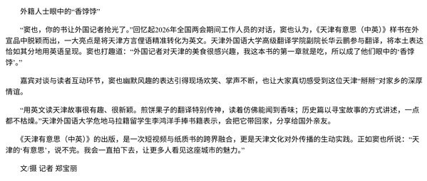《天津有意思(中英)》的出版,是一次短视频与纸质书的跨界融合,更是天津文化对外传播的生动实践。正如窦也所说:“天津的‘有意思’,说不完。我会一直拍下去,让更多人看见这座城市的魅力。”