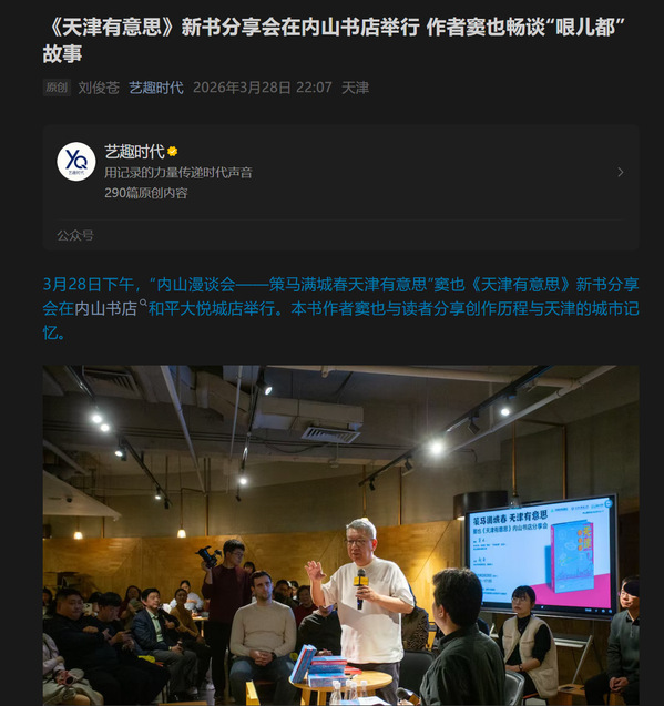 3月28日下午,“内山漫谈会——策马满城春天津有意思”窦也《天津有意思》新书分享会在内山书店和平大悦城店举行。本书作者窦也与读者分享创作历程与天津的城市记忆。