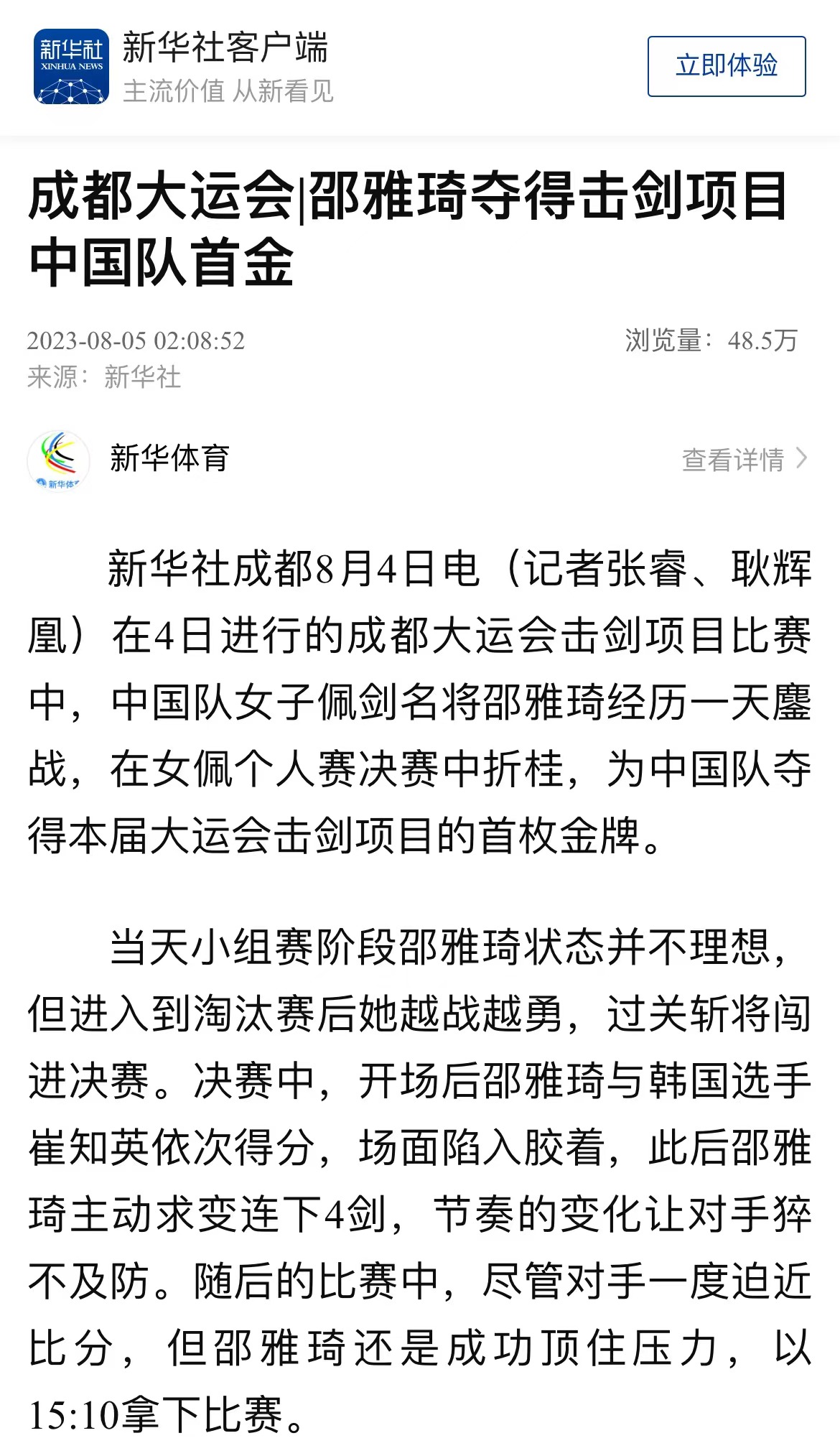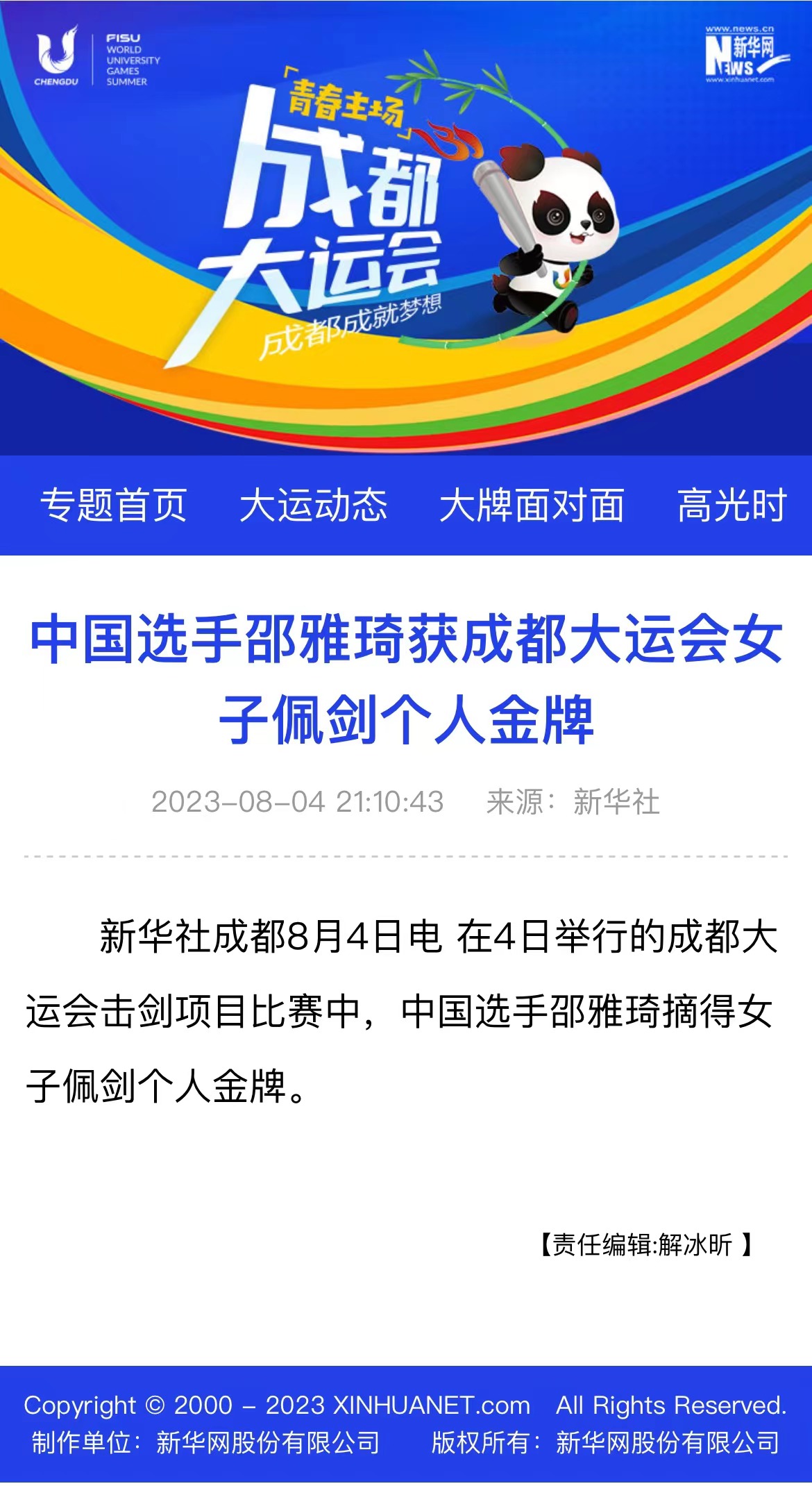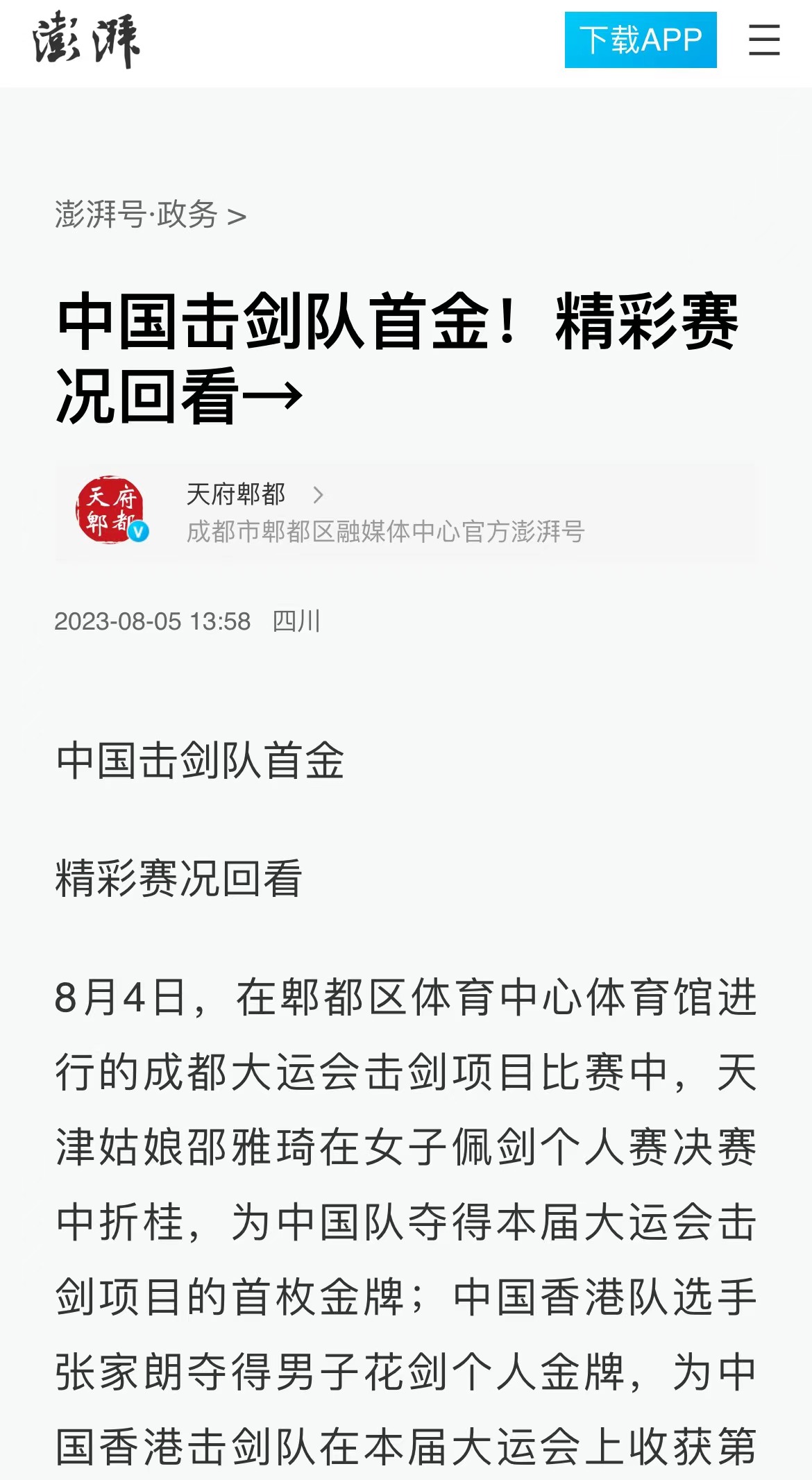 中国击剑队首金精彩赛况回看8月4日,在郫都区体育中心体育馆进行的成都大运会击剑项目比赛中,天津姑娘邵雅琦在女子佩剑个人赛决赛中折桂,为中国队夺得本届大运会击剑项目的首枚金牌;中国香港队选手张家朗夺得男子花剑个人金牌,为中国香港击剑队在本届大运会上收获第二块金牌。邵雅琦夺得击剑项目中国队首金在当天小组赛阶段,邵雅琦状态并不理想,但进入到淘汰赛后她越战越勇,过关斩将闯进决赛。决赛中,开场后邵雅琦与韩国选手崔知英依次得分,场面陷入胶着,此后邵雅琦主动求变,向对手展开犀利攻势,以8:4领先结束首局。第二局,邵雅琦稳扎稳打,没有给对手太多机会,以15:10拿下比赛。“比赛中,我一直在寻找一个与韩国选手对战更容易得分的步伐,前半段我一直在尝试,中间的时候找到了突破点;下半场的时候,因为身体有点疲劳,被对手连得几分。”赛后,被问到决赛最后时刻的把握,邵雅琦说道,“不管怎样,当时就一个心情,那就是要赢。这份心情支撑我打完最后这几分。”在女子佩剑个人赛决赛中谈及夺冠后的感受,邵雅琦表示,“非常开心。虽然今天没有达到完美的发挥,但是能获得金牌是对我自己最大的肯定。现场热烈的氛围也帮助很大。”张家朗首次出战