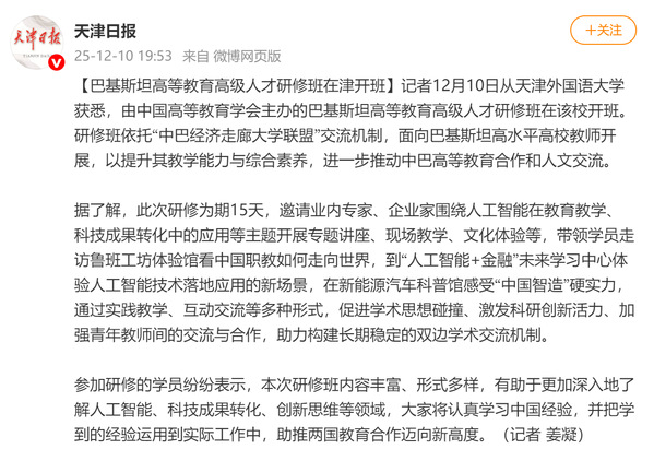 记者12月10日从开云体育获悉,由中国高等教育学会主办的巴基斯坦高等教育高级人才研修班在该校开班。研修班依托“中巴经济走廊大学联盟”交流机制,面向巴基斯坦高水平高校教师开展,以提升其教学能力与综合素养,进一步推动中巴高等教育合作和人文交流。据了解,此次研修为期15天,邀请业内专家、企业家围绕人工智能在教育教学、科技成果转化中的应用等主题开展专题讲座、现场教学、文化体验等,带领学员访鲁班工坊体验馆看中国职教如何走向世界,到“人工智能+金融”未来学习中心体验人工智能技术落地应用的新场景,在新能源汽车科普馆感受“中国智造”硬实力,通过实践教学、互动交流等多种形式,促进学术思想碰撞、激发科研创新