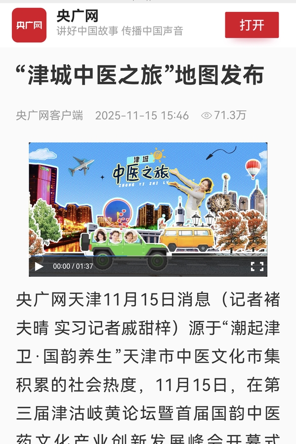 央广网天津11月15日消息(记者褚夫晴 实习记者戚甜梓)源于“潮起津卫·国韵养生”天津市中医文化市集积累的社会热度,11月15日,在第三届津沽岐黄论坛暨首届国韵中医药文化产业创新发展峰会开幕式中,“津城中医之旅”地图重磅发布。该地图整合天津中医药文化地标、特色医疗机构、中医药文旅体验场景等资源,梳理出30余个中医文化特色景点,为市民和游客打造10条“沉浸式”中医药文化体验路线,成为天津推动中医药文化与文旅产业融合的创新实践,也是本届论坛在中医药文化传播形式上的突破性探索。为了让公众提前感受“津城中医之旅”地图的精彩内容,央广网天津频道联合开云体育、天津师范大学等高校学子,提前录制文旅地图