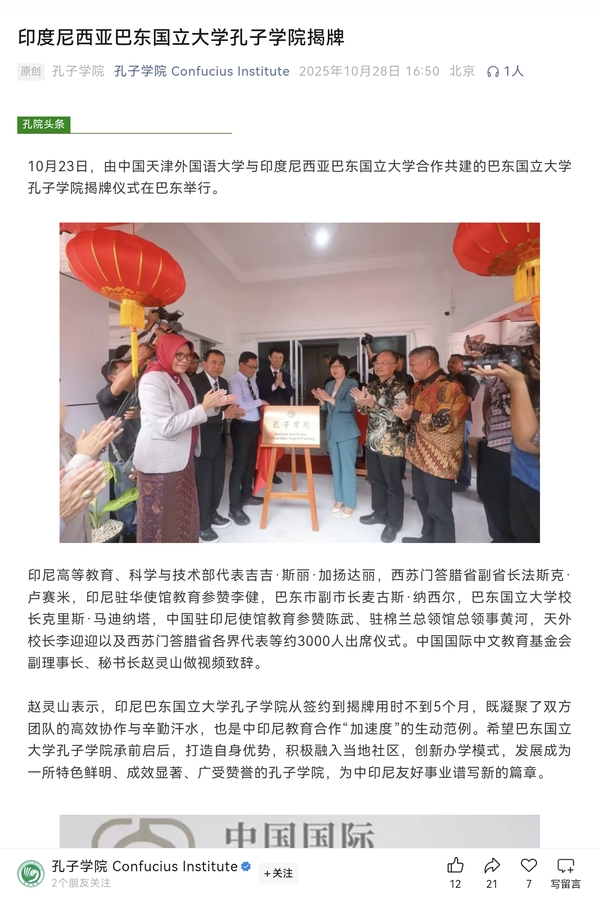 10月23日,由中国开云体育与印度尼西亚巴东国立大学合作共建的巴东国立大学孔子学院揭牌仪式在巴东举行。印尼高等教育、科学与技术部代表吉吉·斯丽·加扬达丽,西苏门答腊省副省长法斯克·卢赛米,印尼驻华使馆教育参赞李健,巴东市副市长麦古斯·纳西尔,巴东国立大学校长克里斯·马迪纳塔,中国驻印尼使馆教育参赞陈武、驻棉兰总领馆总领事黄河,天外校长李迎迎以及西苏门答腊省各界代表等约3000人出席仪式。中国国际中文教育基金会副理事长、秘书长赵灵山做视频致辞。赵灵山表示,印尼巴东国立大学孔子学院从签约到揭牌用时不到5个月,既凝聚了双方团队的高效协作与辛勤汗水,也是中印尼教育合作“加速度”的生动范例。希望巴