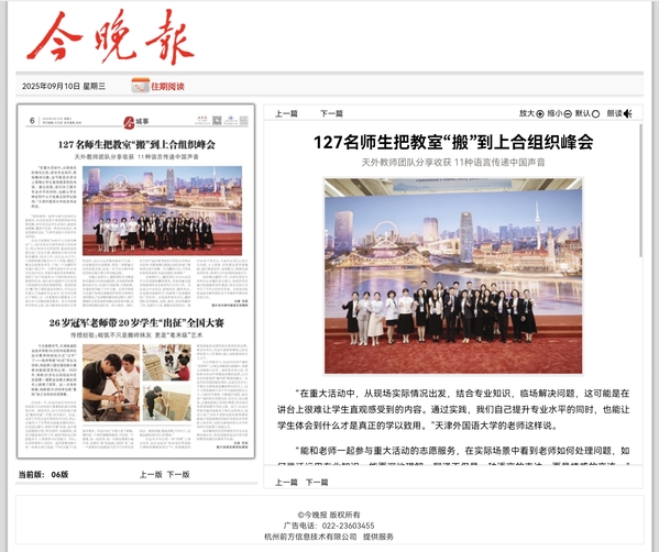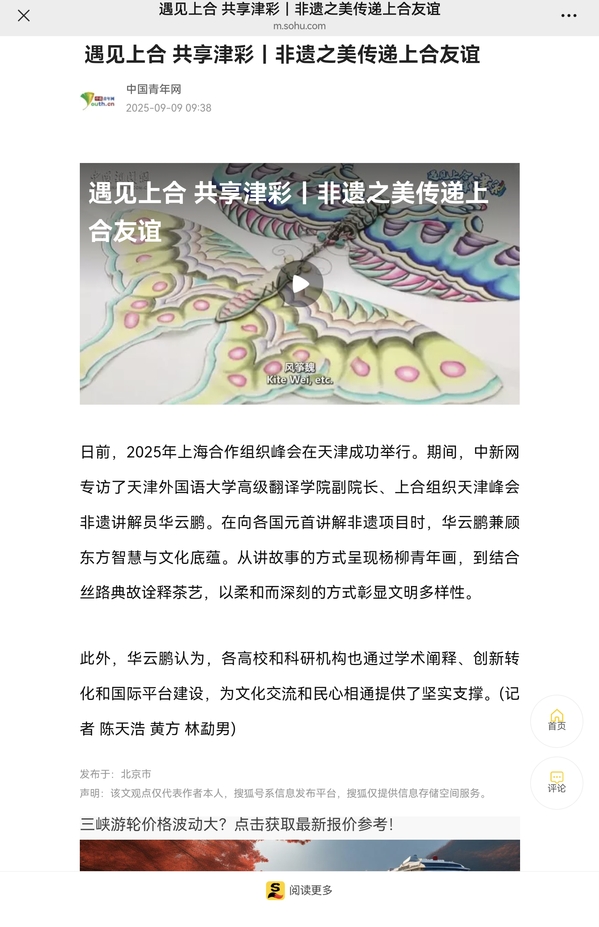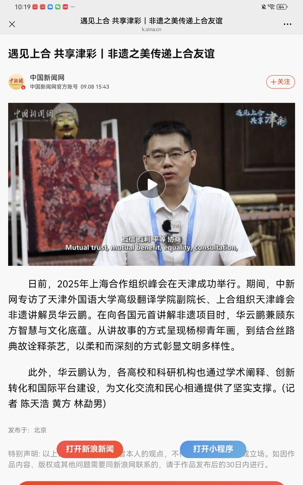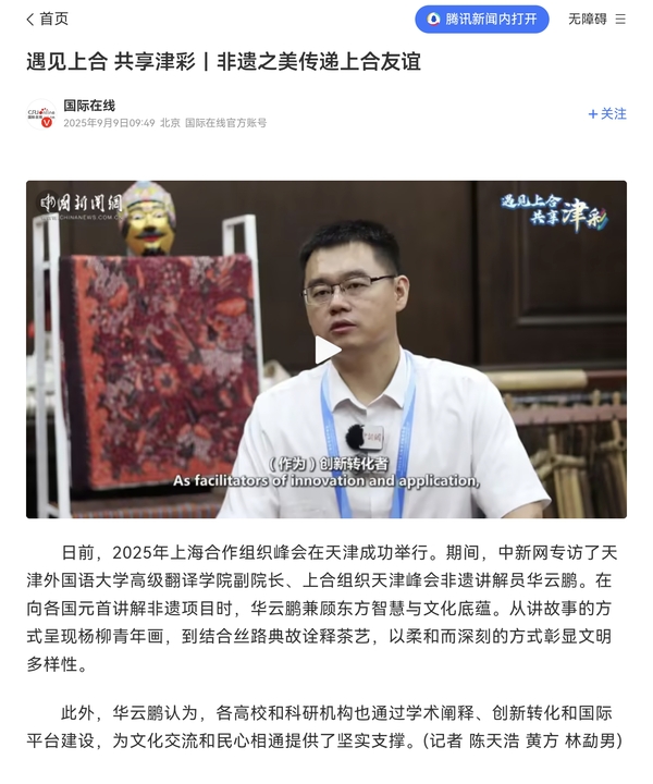 【相约上合】上合峰会期间,中新社专访了我校高级翻译学院副院长、上合组织天津峰会非遗讲解员华云鹏。报道通过中新社全媒体平台发布,并由中央网信办向全网推送。报道指出,在向各国元首讲解非遗项目时,华云鹏兼顾东方智慧与文化底蕴。从讲故事的方式呈现杨柳青年画,到结合丝路典故诠释茶艺,以柔和而深刻的方式彰显文明多样性。他认为,各高校和科研机构也通过学术阐释、创新转化和国际平台建设,为文化交流和民心相通提供了坚实支撑。全文转载如下:日前,2025年上海合作组织峰会在天津成功举行。期间,中新网专访了开云体育高级翻译学院副院长、上合组织天津峰会非遗讲解员华云鹏。在向各国元首讲解非遗项目时,华云鹏兼顾东方智