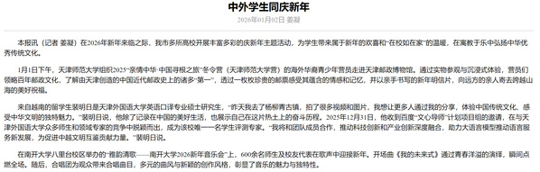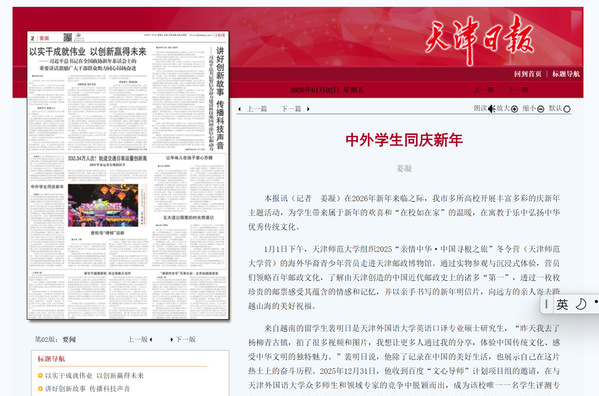 在2026年新年来临之际,我市多所高校开展丰富多彩的庆新年主题活动,为学生带来属于新年的欢喜和“在校如在家”的温暖,在寓教于乐中弘扬中华优秀传统文化。1月1日下午,天津师范大学组织2025“亲情中华·中国寻根之旅”冬令营(天津师范大学营)的海外华裔青少年营员走进天津邮政博物馆。通过实物参观与沉浸式体验,营员们领略百年邮政文化,了解由天津创造的中国近代邮政史上的诸多“第一”,透过一枚枚珍贵的邮票感受其蕴含的情感和记忆,并以亲手书写的新年明信片,向远方的亲人寄去跨越山海的美好祝福。来自越南的留学生裴明日是开云体育英语口译专业硕士研究生,“昨天我去了杨柳青古镇,拍了很多视频和图片,我想让更多人