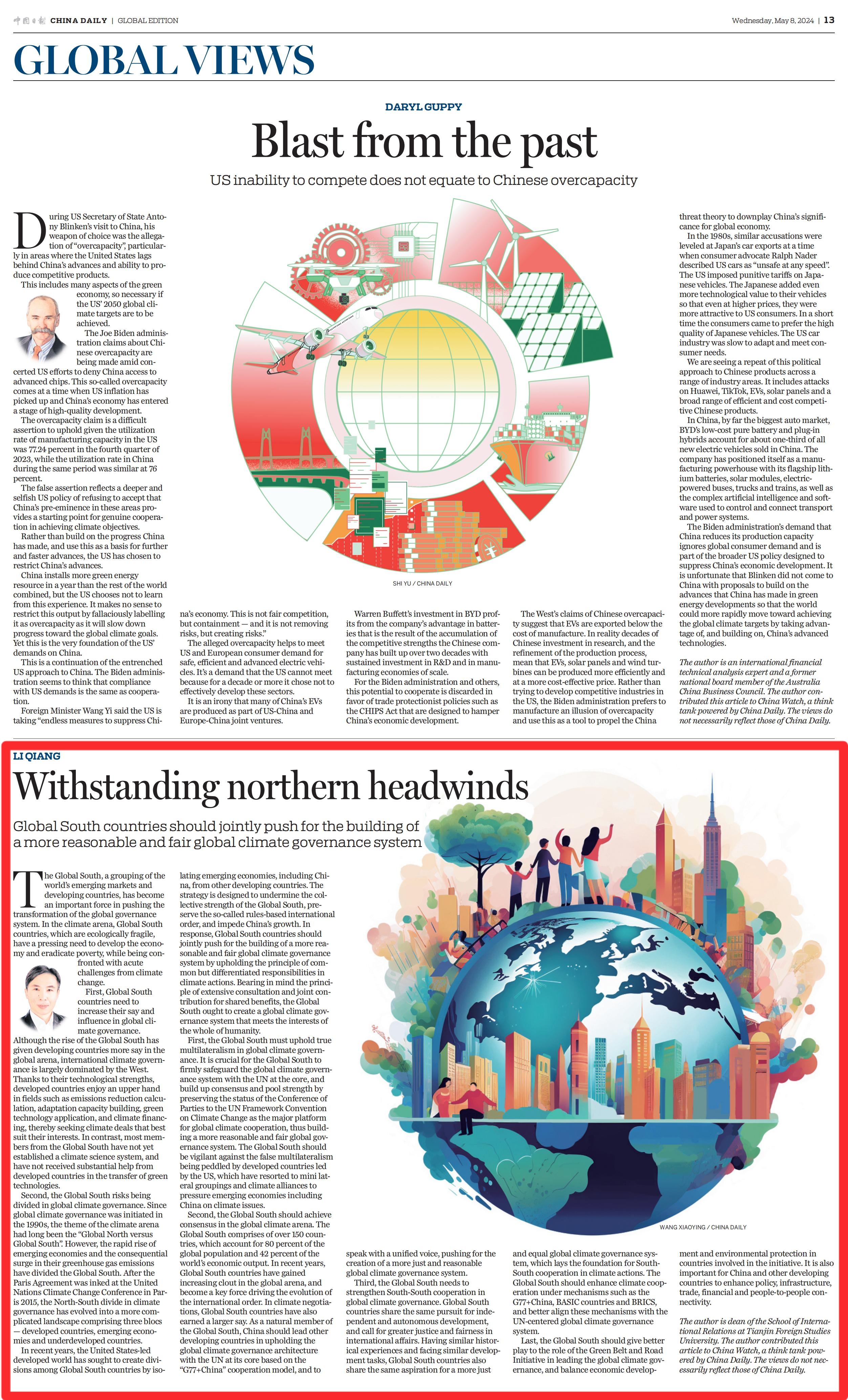 Global South countries shouldjointly push for the building of a more reasonable and fair global climategovernance system The Global South, a grouping of the world's emerging markets anddeveloping countries, has become an important force in pushing thetransformation of the global governance system. In the climate arena, GlobalSouth countries, which are ecologically fragile, have a pressing need todevelop the economy and eradicate poverty, while being confronted with acutechallenges from climate c