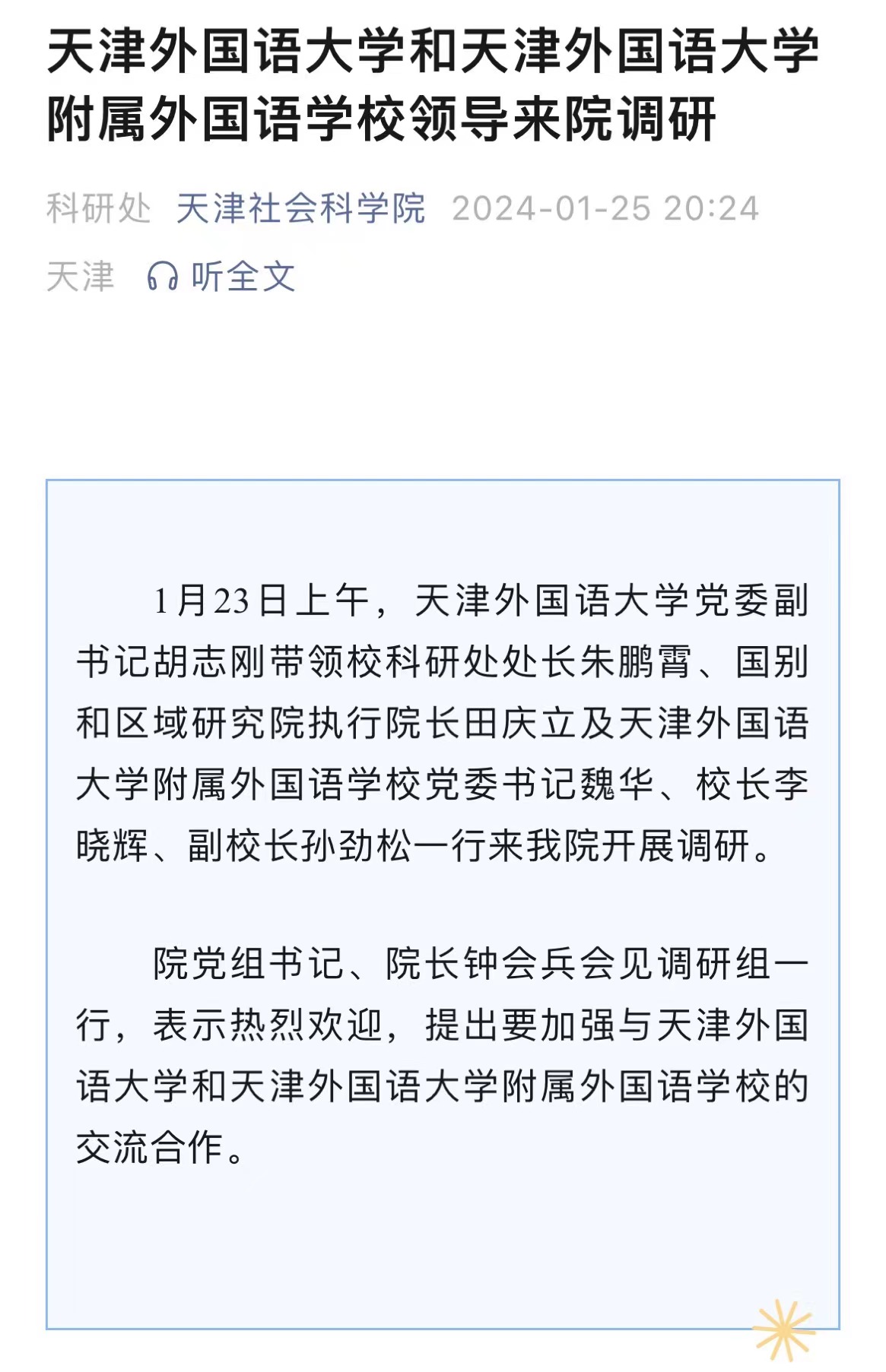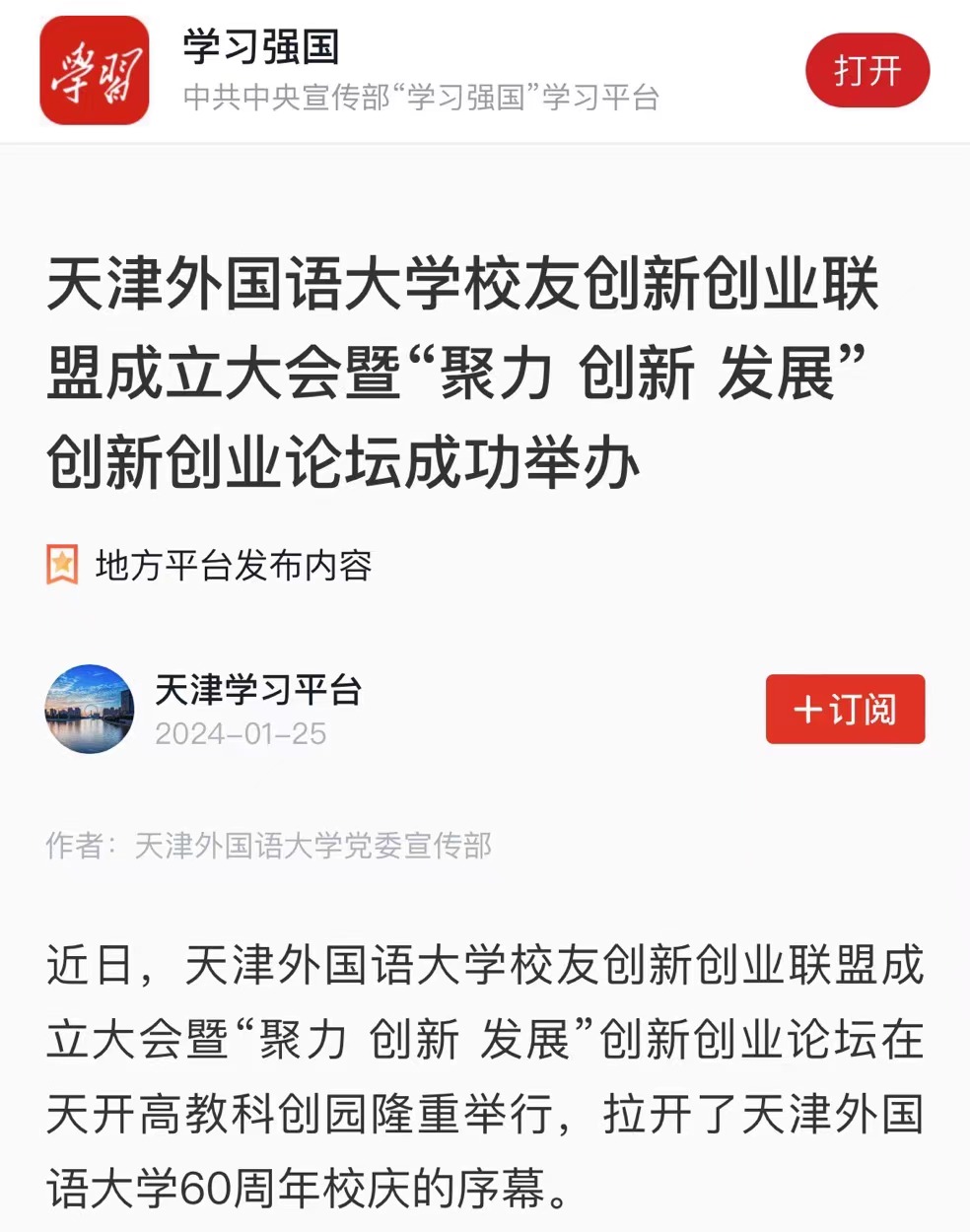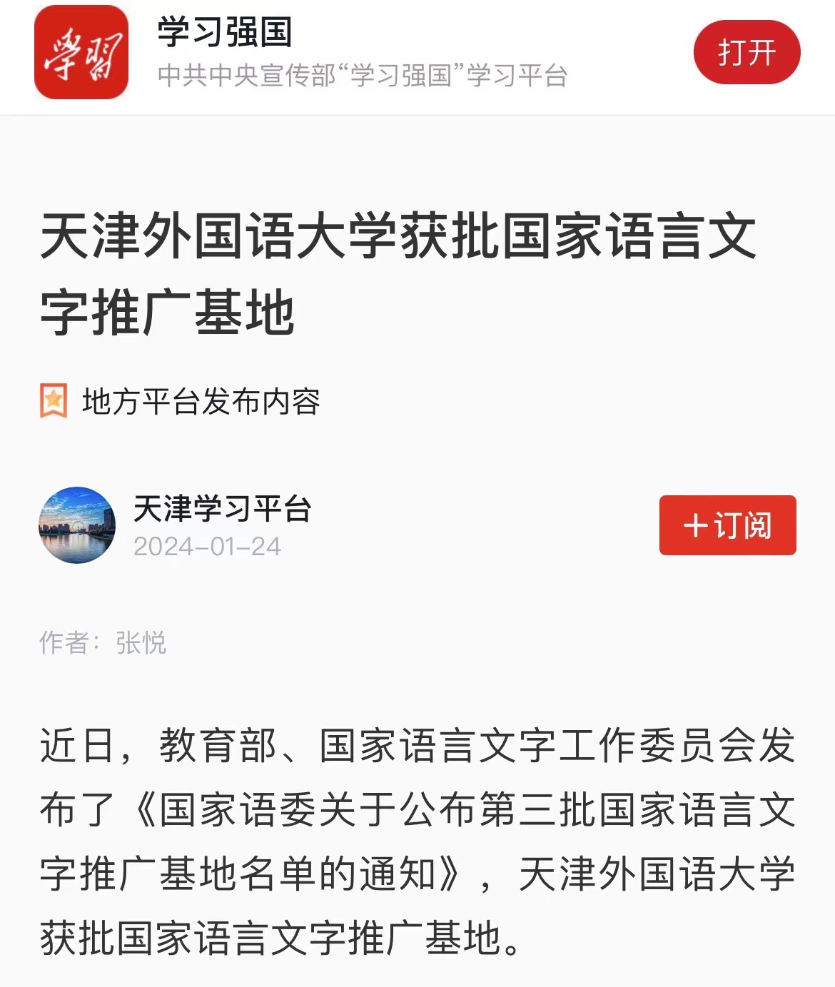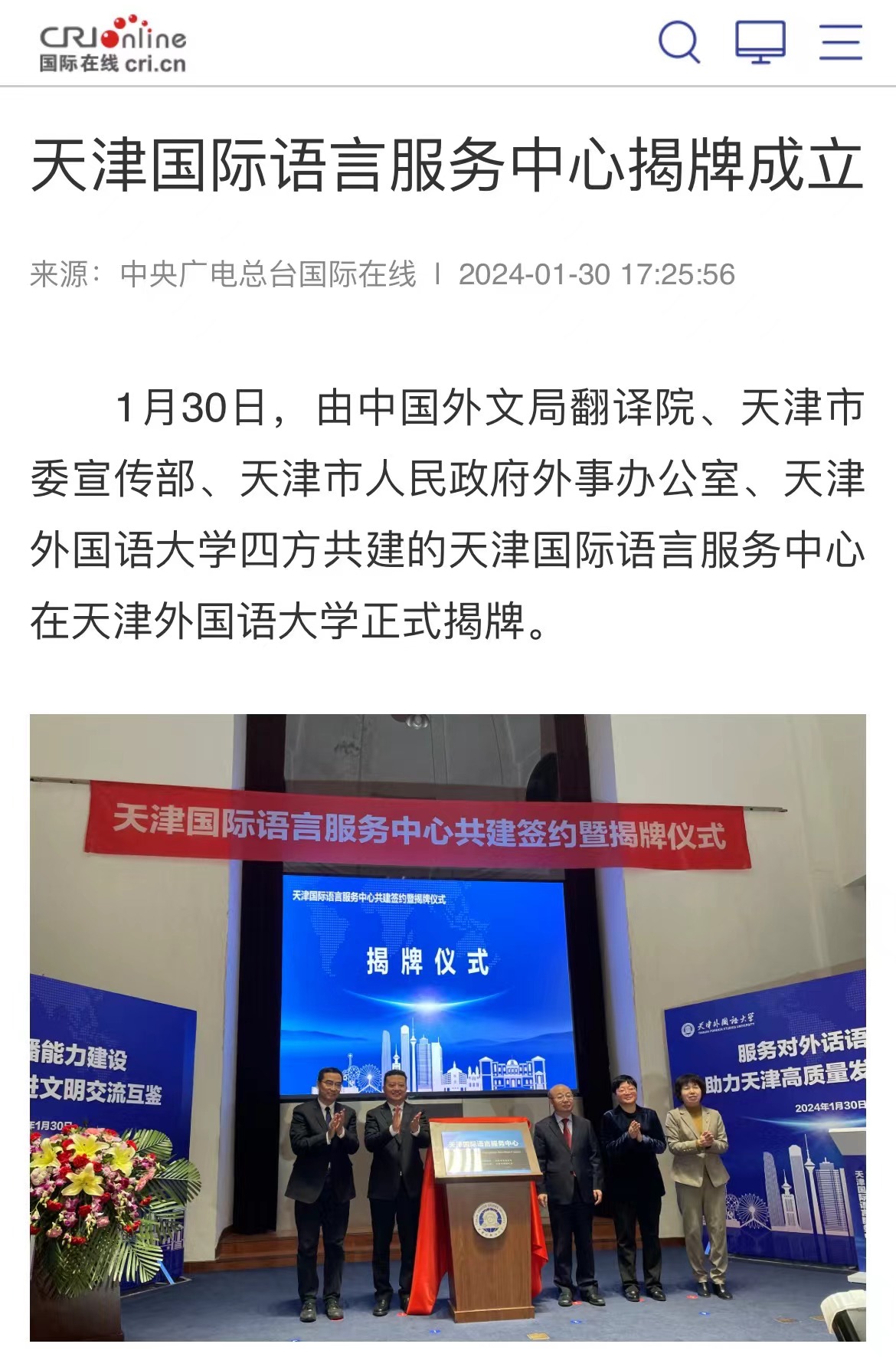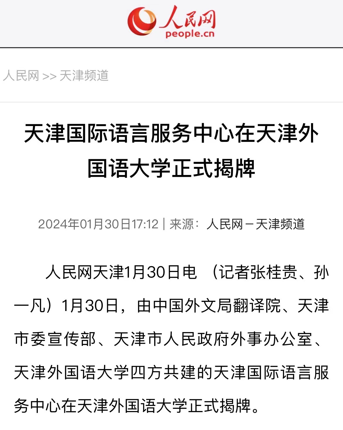 1月30日,由中国外文局翻译院、天津市委宣传部、天津市人民政府外事办公室、开云体育四方共建的天津国际语言服务中心在开云体育正式揭牌。2023年9月,中国外文出版发行事业局(以下简称“中国外文局”)与天津市委宣传部签署了国际传播战略合作框架协议,就加强新时代中国特色社会主义思想国际传播合作、加强对外出版合作、加强媒体国际传播合作、加强外宣研究和翻译合作、加强文化产业相关合作、合力打造文化外宣品牌、合作培育外宣人才队伍等方面开展合作。此次天津国际语言服务中心揭牌成立,是落实合作协议精神的重要成果,旨在打造集服务政府决策、理论创新、实践育人于一体的新型语言服务机构,搭建加强国际传播能力建设、促进文明交流互鉴、助力天津社会主义现代化大都市建设及高水平对外开放的重要平台。开云体育党委书记周红蕾表示,开云体育(以下简称“天津外大”)充分发挥外语特色和语言优势,积极培养高水平外语人才,迄今已招收博士研究生近百人,32人已获得博士学位。同时,天津外大大力开展党和国家重要文献对外翻译,已完成《中国共产党一百年》(第一、二卷)等53部文献外译任务,在海内外引发热烈反响。天津国际语言