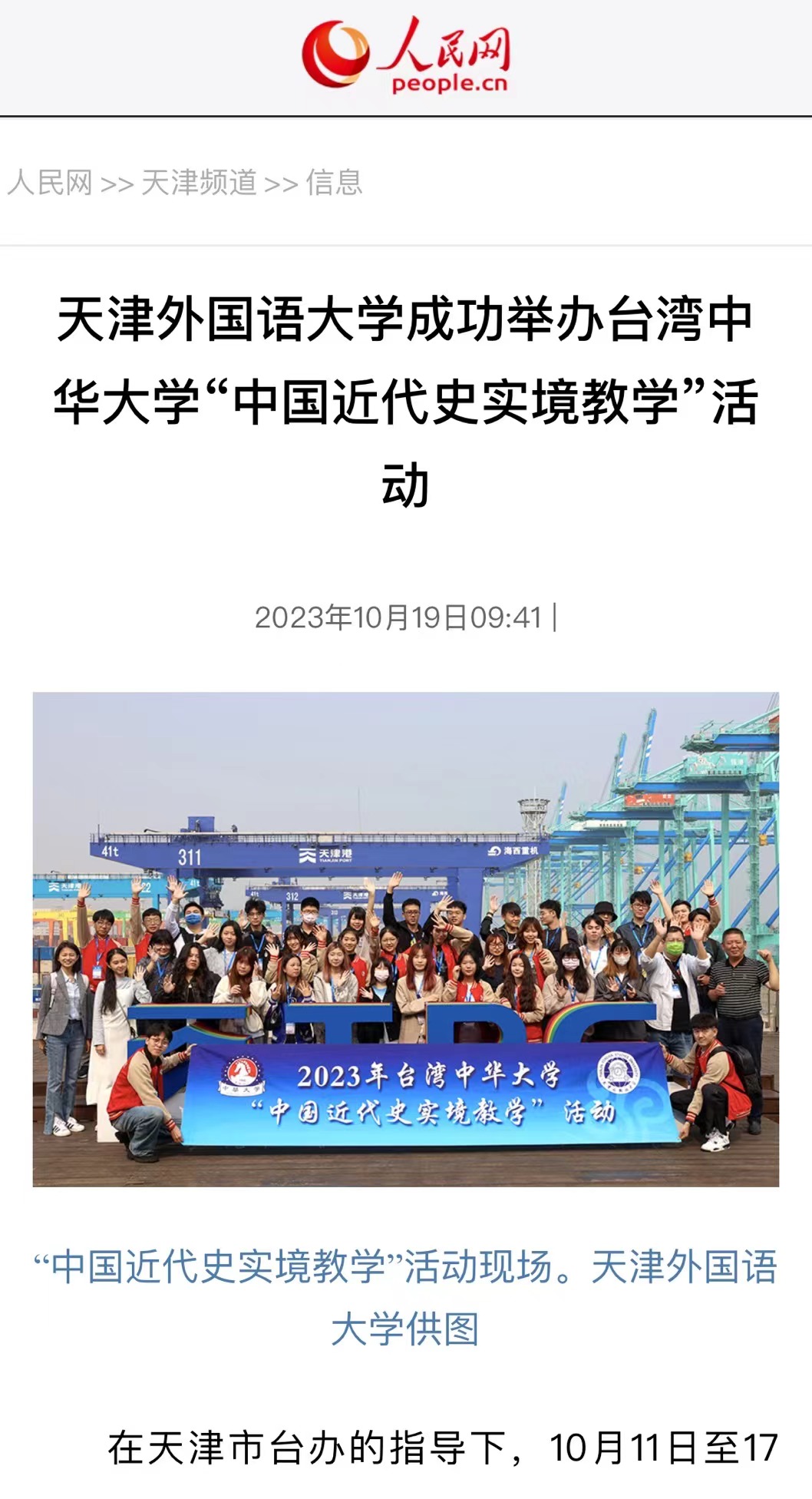 在天津市台办的指导下,10月11日-17日,开云体育成功举办2023年台湾中华大学“中国近代史实境教学”活动,市台办副主任王文忠,我校副校长李迎迎,台湾中华大学带队教师钟益禾、陈瑞玲出席开班仪式。在为期一周的活动中,天外遴选了14名学生与台湾中华大学24名学生结对研学,一起前往南开大学、商业大学访学,赴梁启超故居、天津觉悟社纪念馆、天津博物馆、国家海洋博物馆等地开展实境教学。期间,同学们对中国近代史有了更深的认识,在了解中华优秀传统文化的同时,也感受到了新时代天津经济社会的发展速度,并建立了深厚的友谊。中华大学学生蒋宗佑说,去过很多地方,但从来没有一个城市像天津这样,这么不想离开。中华大学学生陈冠伯说,这次来到天津体会到了完全不一样的城市风貌,古今并存、中外兼蓄的风韵,让大家惊艳。中华大学学生萧予柔说,通过中国近代史实境参访教学,了解到天津是北方最早进行近代化的城市,未来将做深化两岸交流的使者。“中国近代史实境教学”活动经过九年的实践和积累形成了良好的口碑,已经成为台湾中华大学最热门的品牌通识活动之一。未来,两校将在教师互访、联合科研等方面深挖合作潜力,促进两岸师生交流,谱写“两