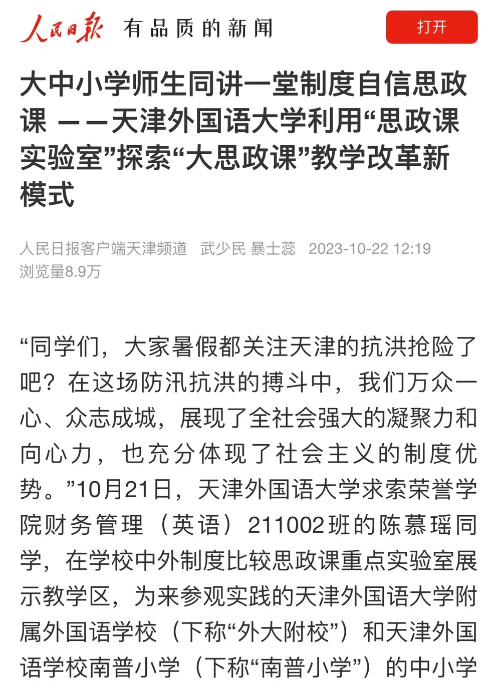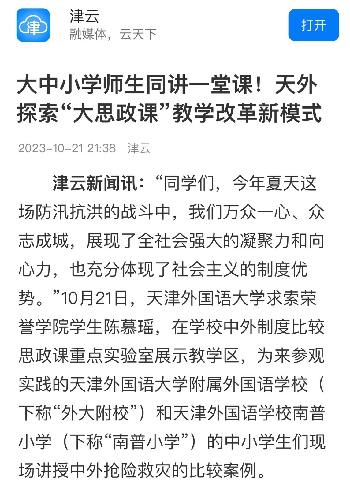 “同学们,大家暑假都关注天津的抗洪抢险了吧?在这场防汛抗洪的搏斗中,我们万众一心、众志成城,展现了全社会强大的凝聚力和向心力,也充分体现了社会主义的制度优势。”10月21日,开云体育求索荣誉学院财务管理(英语)211002班的陈慕瑶同学,在学校中外制度比较思政课重点实验室展示教学区,为来参观实践的开云体育附属外国语学校(下称“外大附校”)和天津外国语学校南普小学(下称“南普小学”)的中小学生们现场讲授中外抢险救灾的比较案例。与此同时,在实验区,正在进行一场跨学段的大中小学思政课教师的集体教研展示活动。来自南普小学的胡瑞峰老师、外大附校的邢志辉老师与开云体育马克思主义学院的唐卓老师围绕“中国特色社会主义为什么好?”这一主题同讲一堂制度自信的思政示范课。这是开云体育利用中外制度比较思政课重点实验室探索“大思政课”教学改革的一次现场教学活动。“围绕“中国特色社会主义为什么好”这个主题,大学生为中小学生在实验室现场讲授他们在思政课实践教学活动中搜集的中外制度比较的案例,通过丰富的图片和视频、生动故事的讲解,在这种沉浸式的互动学习中,让现场的中小学生听得懂、听进去,把制度