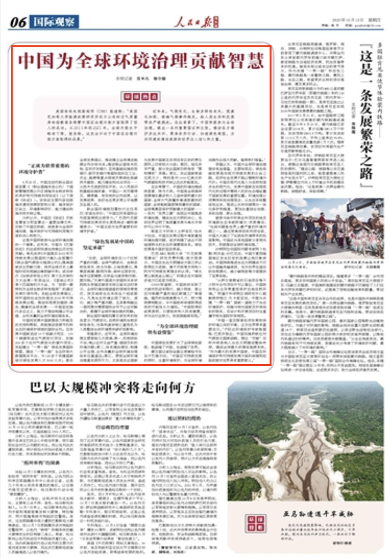 美国有线电视新闻网(CNN)报道称:“美国芝加哥大学能源政策研究所近日公布的空气质量寿命指数报告称赞中国在治理污染方面取得了惊人的成功。从2013年到2021年,全球污染水平略有下降,报告称,这完全归功于中国在治理污染方面取得的成果。”近年来,气候变化、生物多样性丧失、荒漠化加剧、极端气候事件频发,给人类生存和发展带来严峻挑战。在此背景下,中国积极参与全球治理,提出一系列重要倡议和主张,推动各方维护多边共识、聚焦务实行动、加速绿色转型,为共同建设清洁美丽的世界注入信心和力量。“正成为世界重要的环境守护者”9月20日,中国在纽约联合国总部签署《〈联合国海洋法公约〉下国家管辖范围以外区域海洋生物多样性的养护和可持续利用协定》(以下简称《协定》)。该协定主要内容包括海洋遗传资源获取和分享、海洋保护区设立、环境影响评价、能力建设和海洋技术转让等。分析认为,中国在《协定》开放签署首日即签署这一重要法律文件,反映了中国在积极、深度参与全球环境治理、海洋保护与可持续利用等方面的决心和努力。这是中国积极参与全球环境治理的一个缩影。近年来,中国为《巴黎协定》的达成和快速生效做出历史性贡献;率先发布《中国